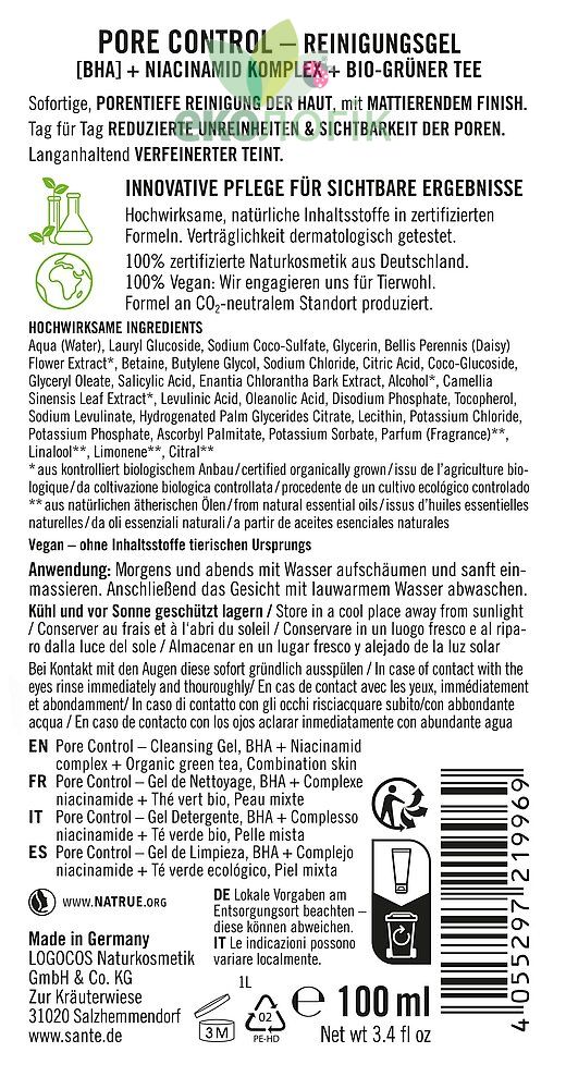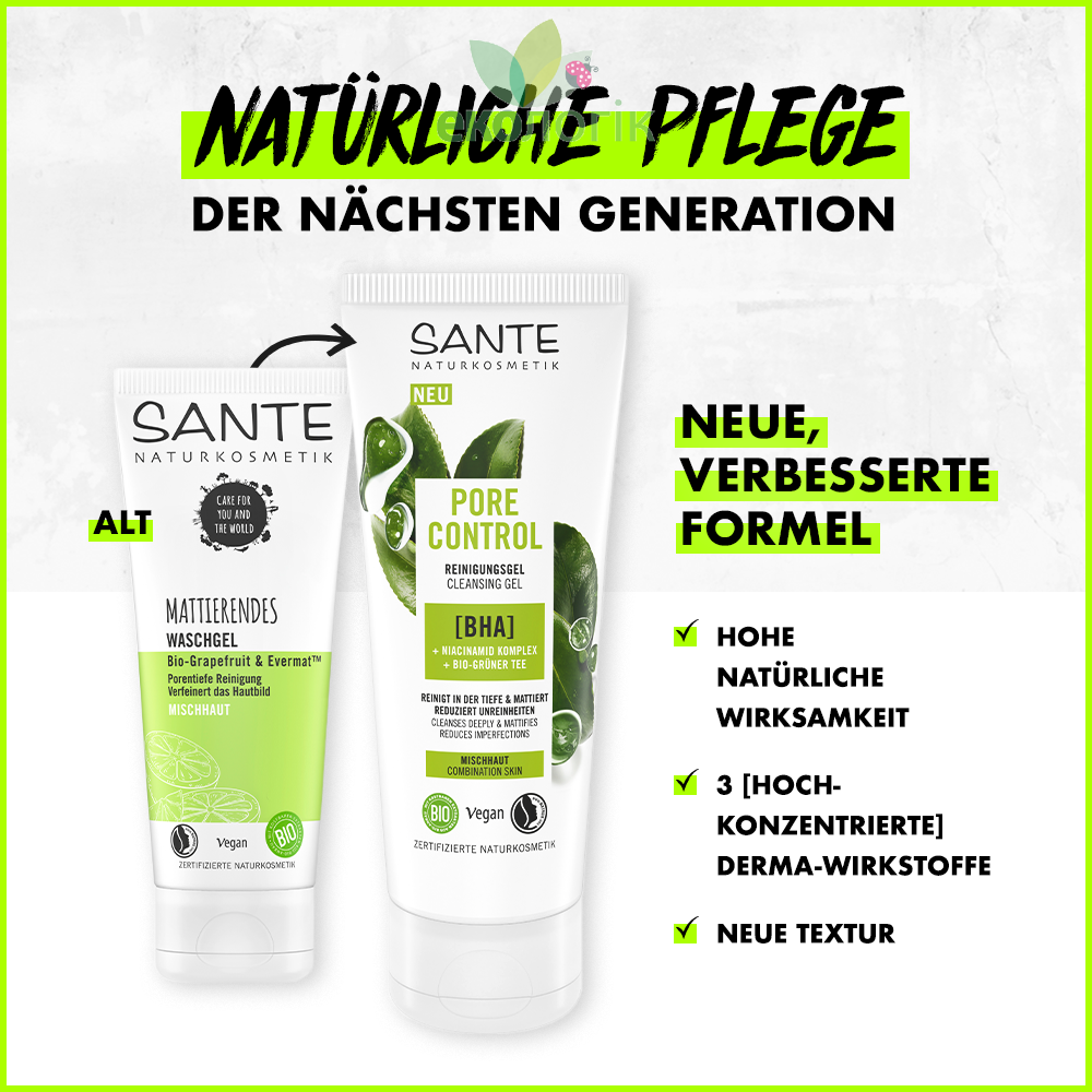 Матуючий гель для вмивання обличчя з протизапальним ефектом, що глибоко очищує шкіру, прибирає надлишок шкірного жиру та мінімізує видимість пор, суттєво покращуючи стан та тон шкіри. Антимікробні та протизапальні властивості ніацинамідного комплексу, знижують активність бактерій, які провокують акне. Ніацинамід знімає почервоніння, зменшує кількість прищів, сприяє усуненню слідів від вугрової висипки. Щоденно вмивайся з гелем PORE CONTROL від SANTE NATURKOSMETIK, щоб мати матовий рівний колір обличчя і забути, що таке запалення шкіри! Саліцилова ВНА-кислота, проникає крізь жирову плівку шкіри вглиб запалених пор і знищує там бактерії та мікроби, очищуючи від забруднень та зменшуючи запалення. Екстракти зеленого чаю та маргаритки природньо відбілюють шкіру та покращують колір обличчя, а також сприяють природному оновленню клітин. Зелений чай виводить токсини з підшкірної клітковини та зміцнює стінки судин, покращуючи структуру шкіри завдяки сильним регенеруючим властивостям. Активна формула на основі екстракту кори енантії хлоранта і олеанолової кислоти значно скорочує кількість гіперактивних сальних залоз, завдяки чому досягається більш рівний тон обличчя, звужуються пори й усувається жирний блиск, приводячи в баланс твою шкіру!