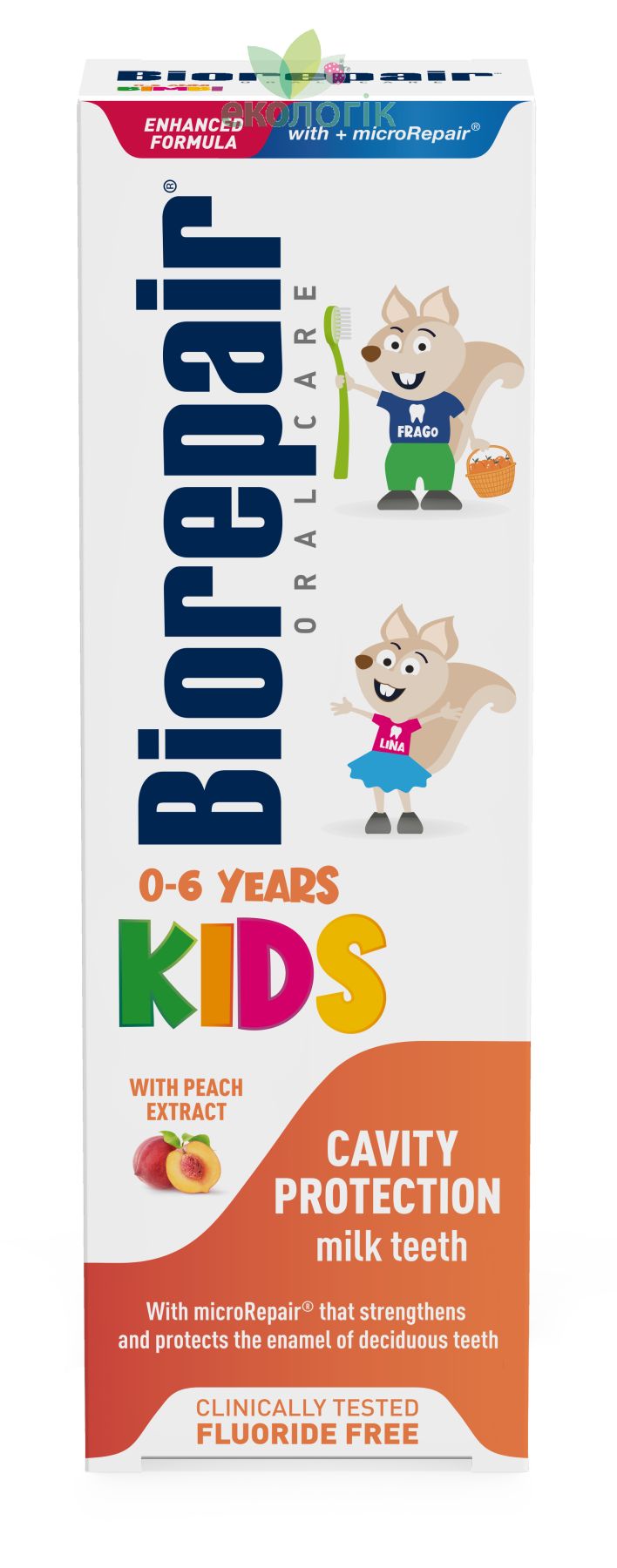 Це єдина дитяча зубна паста з MicroRepair 15% (Рідка емаль), що укріплює, ремінералізує та захищає дитячі зубки і при цьому не містить фтор. Абсолютно безпечна екстра м’яка формула пасти, в якій враховано всі фізіологічні особливості дитячої ротової порожнини, ідеально підходить для щоденного догляду за дитячою ротовою порожниною, починаючи з першого зубчика. Паста містить натуральний екстракт персик, який містить велику кількість вітамінів (С, Е, Н, групи В), макроелементів (кальцій, магній, фосфор), мікроелементів (йод, залізо, селен). Має корисні, особливо для дитячого віку, властивості: живить та захищає ясна, чинить протизапальну, антимікробну, протикаріозну, противірусну та імуностимулюючу дію. Має дивовижно приємний смак, що стимулює дитину до регулярного чищення зубів.
