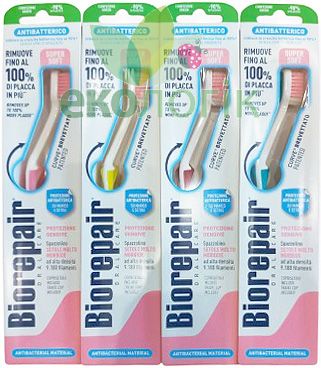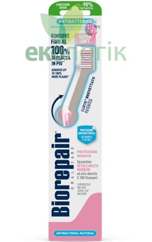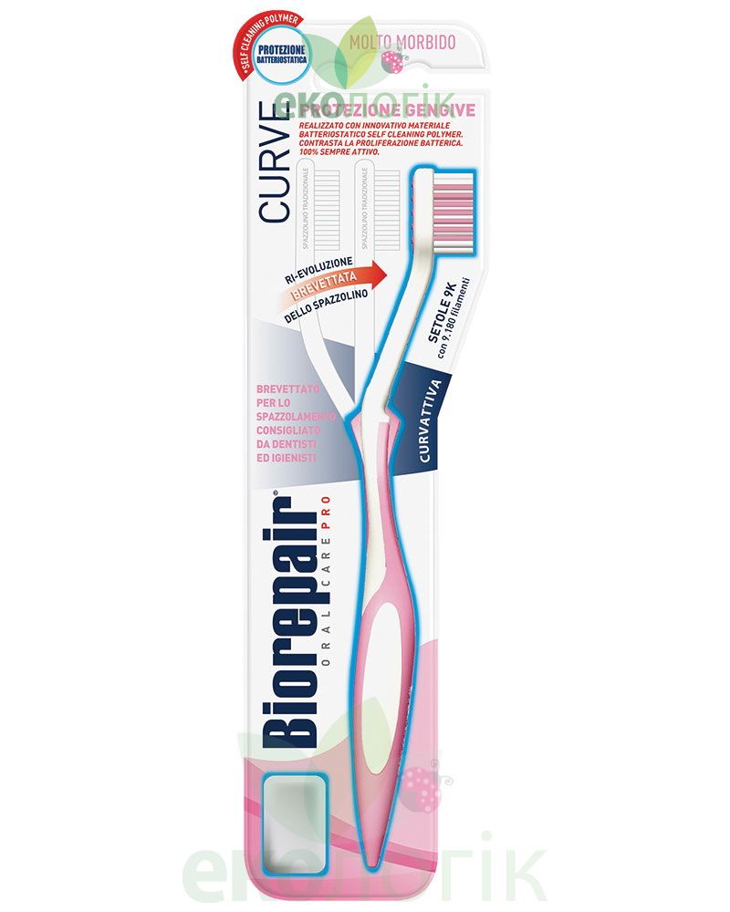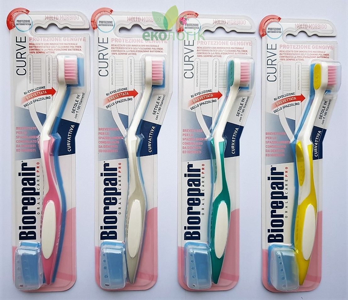Розроблена італійськими стоматологами-гігієністами для досконалого щоденного чищення зубів, ясен та язика. Унікальний запатентований вигин «Biorepair CURVACTIVE», спеціальна форма голівки та 9180 надзвичайно м’яких щетинок дозволяють максимально щільно прилягати до поверхні зубів, що підвищує якість чищення зубів, міжзубних проміжків і ділянок уздовж лінії ясен. Ультрам’які, конусоподібні, з ретельно закругленими лазером кінчиками щетинки, ефективно і безпечно, не пошкоджуючи чутливі ясна, видаляють наліт і пігментацію навіть із самих важкодоступних поверхонь. Кут 210° дозволяє уникнути непотрібного тиску на ясна і зуби, а спеціально розроблений, м’який силіконовий очисник, на задній частині щітки, подбає про чистоту щік та язика. Всі деталі щітки виготовлені з інноваційним, запатентованим бактеріостатичним покриттям SCP (самоочисний полімер), завдяки якому бактерії не можуть рости і розмножатися. Бактеріостатична властивість не змінюється і постійно залишається ефективною.