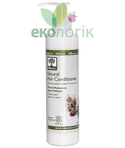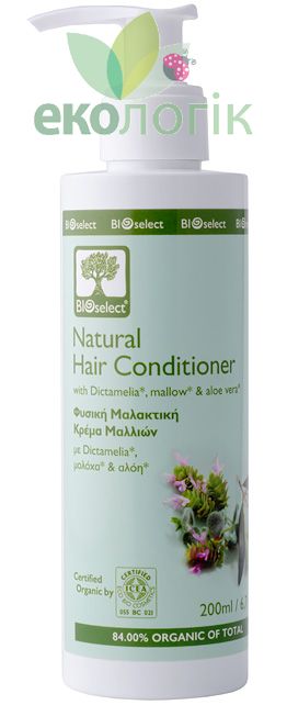 Натуральний кондиціонер-ополіскувач для волосся BIOselect забезпечує дбайливий і м'який догляд, сприяє відновленню пошкодженого і ламкого волосся. Кондиціонер, завдяки натуральному складу, рекомендований для використання після кожного миття голови. Такий догляд забезпечить глибоке зволоження та живлення волосків, перешкоджаючи їх сплутування і полегшуючи розчісування. Склад кондиціонеру містить діктамелію, сік алое і екстракт квіток мальви. Діктамелія (витяжка з оливкового листя і квіток діктамо) забезпечує інтенсивне зволоження та живлення, що дозволяє регулярно використовувати бальзам-ополіскувач для сухого волосся. Завдяки соку алое, бальзам відновлює природне сяйво локонів, діючи як кондиціонер для фарбованого волосся. Екстракт мальви, що входить до бальзаму-ополіскувача, відновлює їх по всій довжині, повертає пружність та шовковистість. Таким чином, натуральний ополіскувач BIOSelect, завдяки полінасиченому складу, стимулює омолодження волосся, відновлює їх структуру, сяйво, пружність та дарує локонам ніжний аромат мальви.
