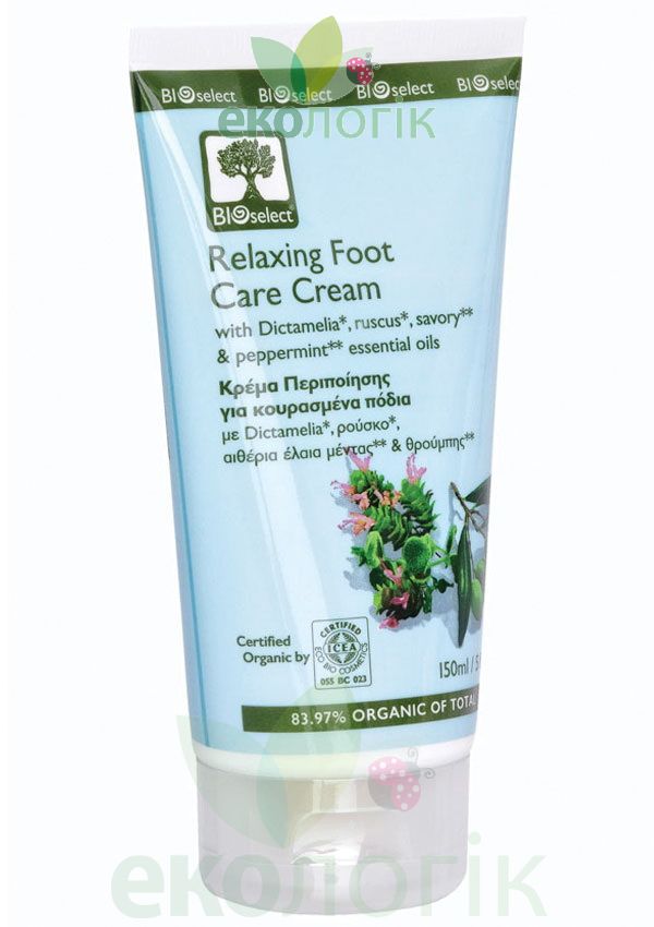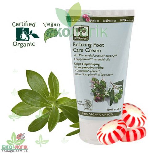 Розслабляючий крем для ніг Bioselect не тільки допомагає позбутися тяжкості в ногах, але й покращує їх кровообіг, пом'якшує епітелій, відновлює цілісність потрісканої шкіри. Багатофункціональність, яким характеризується натуральний крем для ніг, заснована на ефективній формулі, що складається з органічних компонентів. У серці грецької рецептури лежать: діктамелія, екстракт рускусу, морські мінерали, ефірні олії м'яти і чебрецю. Бальзам діктамелія (оливкова олія та збагачений рослинний екстракт діктамо)- дозволяє ефективно позбавлятися тріщин на ступнях, загоюючи та відновлюючи захисний шар шкіряного покрову. Завдяки ефірній олії чебрецю має антисептичні, протизапальні і загоюючі властивості. Морські мінерали та ефірна олія м'яти виводять з організму надлишок води, що особливо важливо для вен на ногах, впливають на мікроциркуляцію, дарують відчуття легкості. Дренажний ефект засобу дозволяє використовувати його як крем від варикозу на ногах, попереджаючи розвиток небезпечної недуги.