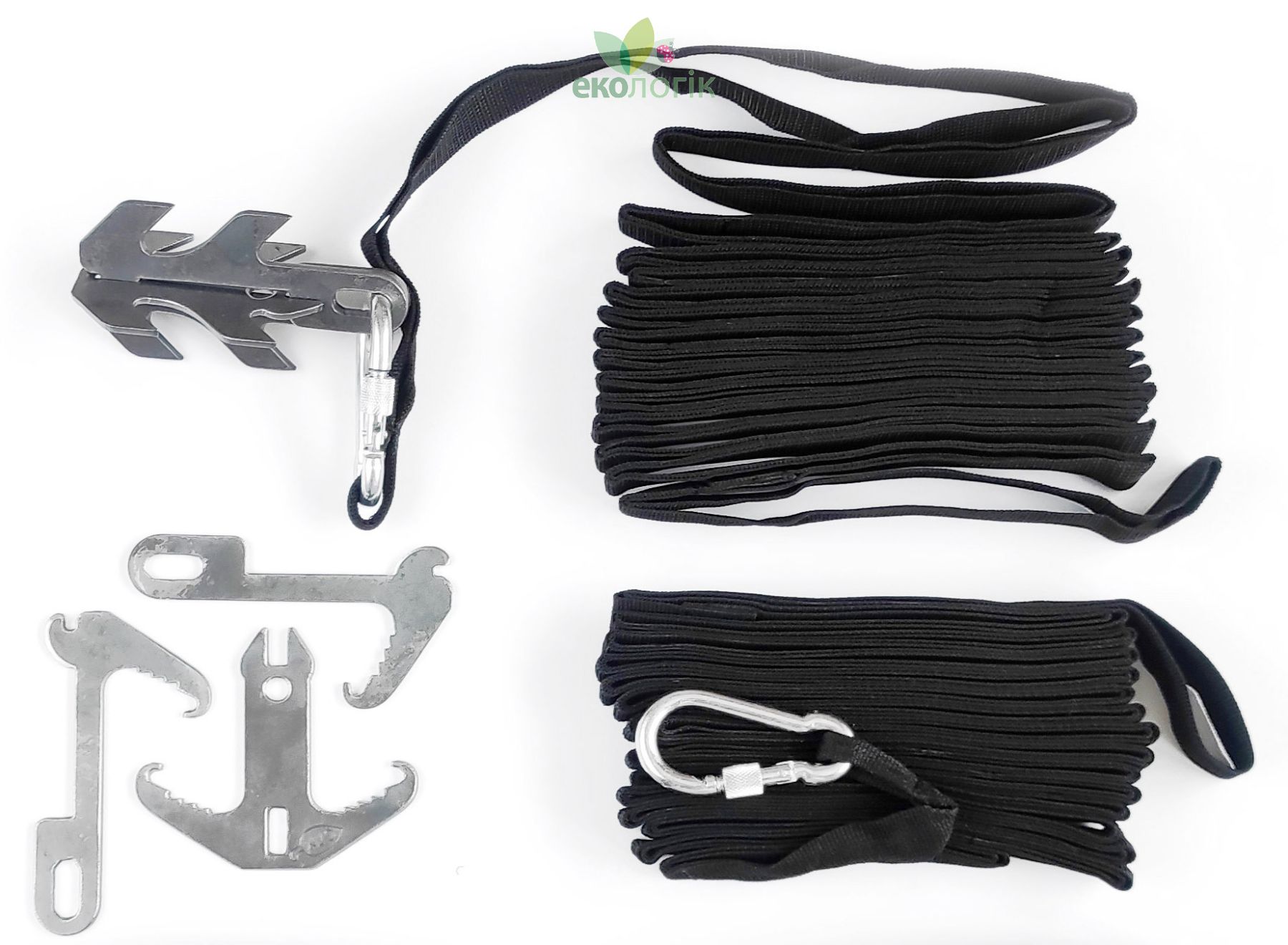 2. Дві стропи: 25 мм (або 40 мм) на 6 метрів кожна; дві паралельні ремінні стрічки прошиті кожні 40 см, утворюючи петлі для перехвату руками, одна з паралельних стрічок перекручена для зручності швидкого просування між ними пальців руки; два карабіни з закрутками 8*80 мм.