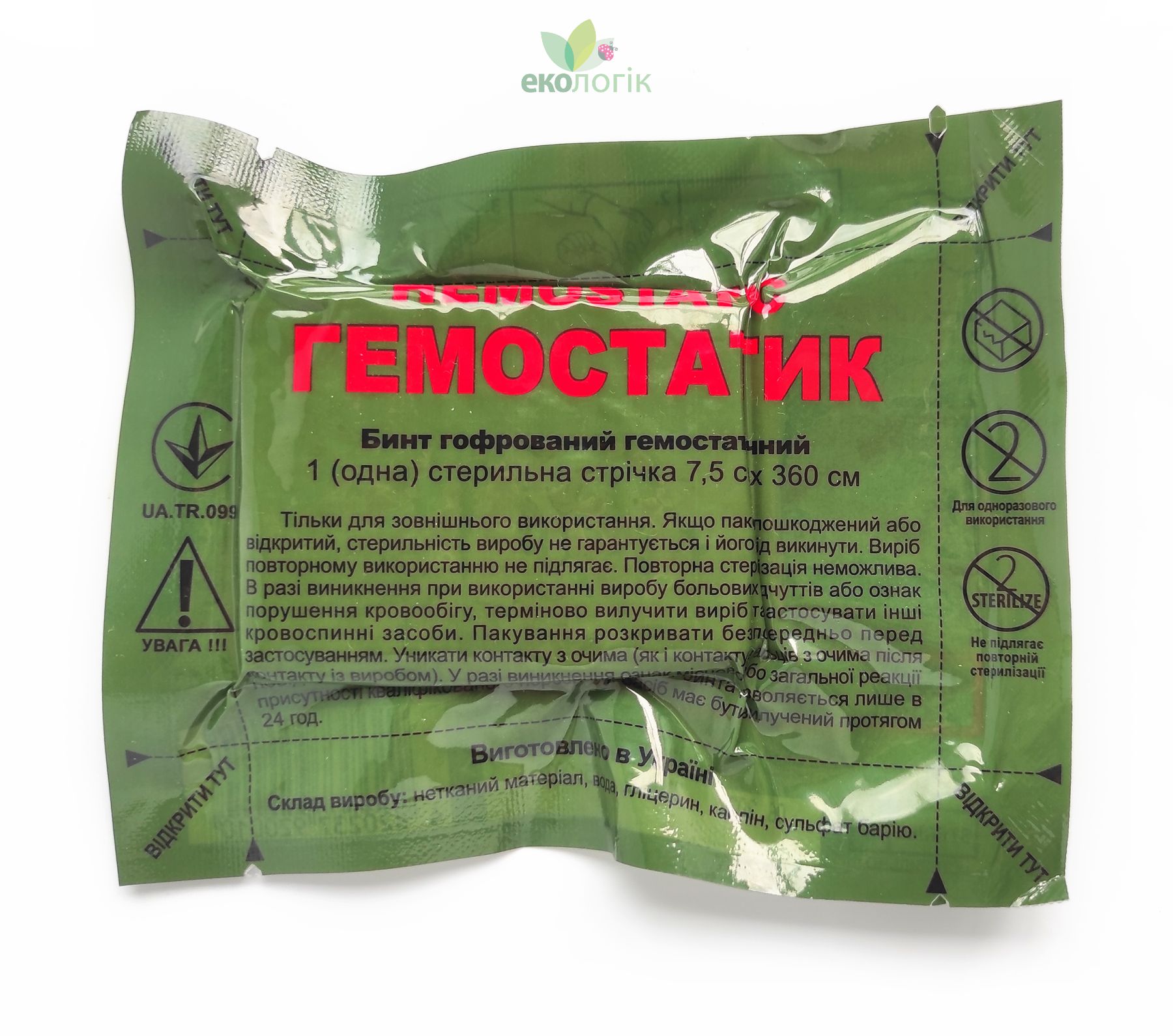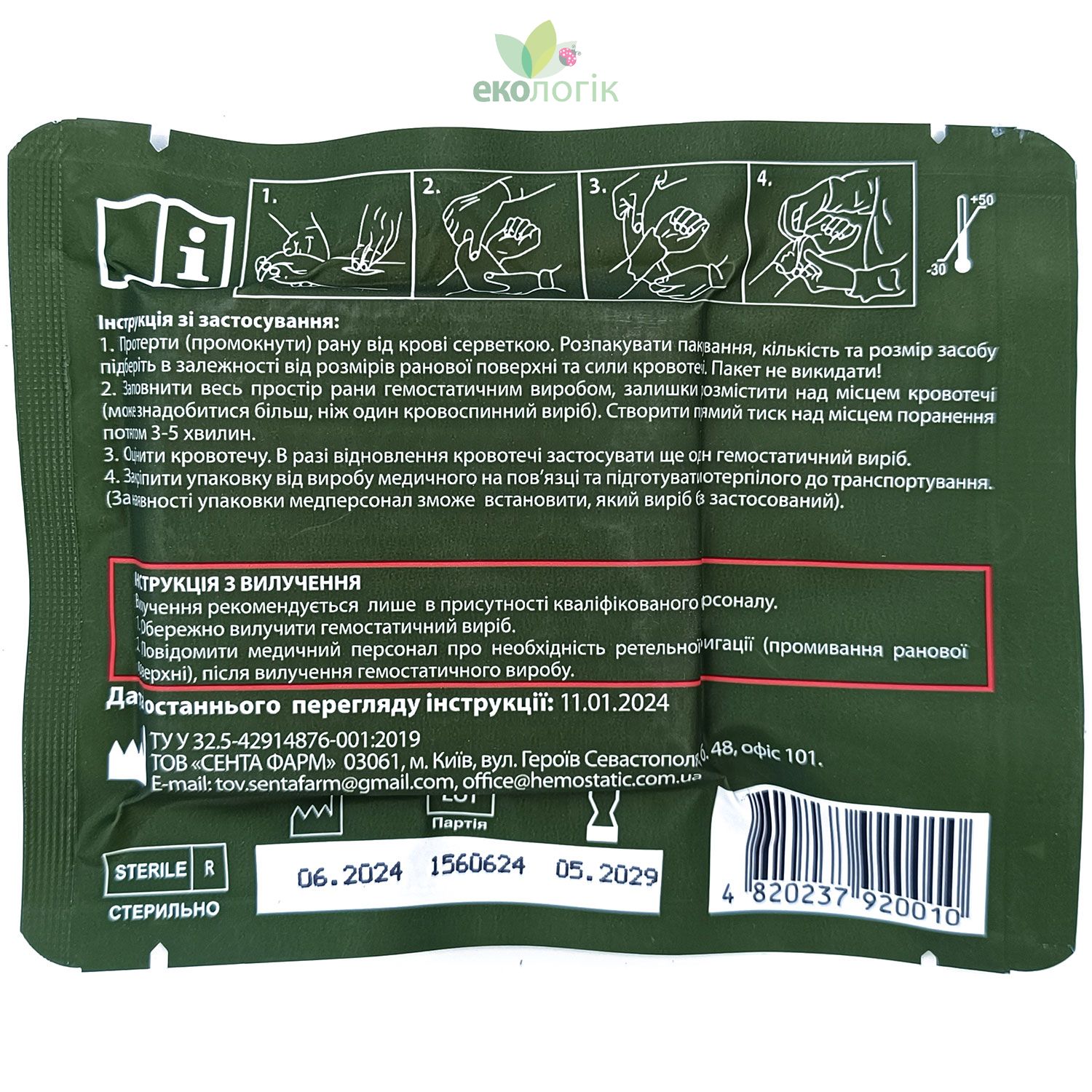 Тільки для зовнішнього використання. Якщо пакет пошкоджений або відкритий, стерильність виробу не гарантується і його слід викинути. Виріб повторному використанню не підлягає. Повторна стерилізація не можлива. В разі виникнення при використанні виробу больових відчуттів або ознак порушення кровообігу, терміново вилучити виріб та застосувати інші кровоспиннi засоби. Пакування розкривати безпосередньо перед застосуванням. Уникати контакту з очима, як і контакту пальців очима, після контакту із виробом. У разі виникнення місцевої або загальної реакції, повідомити медичний персонал. Вилучення бинта дозволяється лише у присутності кваліфікованого персоналу. Засіб має бути вилучений протягом 24 годин. Виготовлено в Україні.