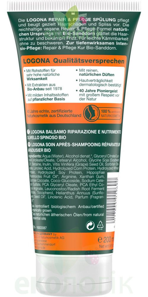 Революційна формула для швидкого відновлення пошкодженого волосся. Кондиціонер LOGONA забезпечує інтенсивну терапію для ламкого волосся, що січеться. Олія обліпихи надає волоссю блиск і шовковистість, сприяє зростанню і зміцненню волосся, а також перешкоджає їх випаданню. Бетаїн (екстракт цукрового буряка) зволожує і знімає подразнення шкіри голови. Комплекс рослинних протеїнів пшениці, сої та кукурудзи проникає в волосяні лусочки, заповнюючи внутрішні порожнечі білком, відновлюючи міцність волосся. Олія виноградних кісточок захищає пасма від ламкості, зміцнює волосяні фолікули, запобігаючи тим самим випадання волосся. Аргінін, як амінокислота в складі кератину, забезпечує інтенсивне зміцнення волосся по всій довжині. Інулін розгладжує власний стовбур, робить волосся легким і шовковистим, забезпечуючи легке розчісування.