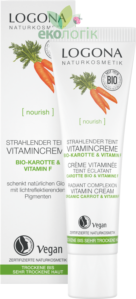 Дивно свіжа і доглянута шкіра! Цей живильний крем наповнить Вашу шкіру здоров'ям і вітамінами, а також додасть сяючий колір обличчя. Крем містить світловідбиваючі пігменти для видимого негайного ефекту рівного тону шкіри. Органічна морква і натуральний вітамін F захищає шкіру від вільних радикалів і забезпечує інтенсивне зволоження, сприяючи збереженню природного гідро-ліпідного балансу. Завдяки Моркві прискорюється процес відновлення клітин, підвищується еластичність шкіри,. В результаті дрібні зморшки зменшуються. Вітамінна цілюща формула крему з біо-маслами какао, ши і жожоба, а також мигдальною і оливковою біо-оліям живить і зволожує шкіру, дарує їй еластичність і пружність, а натуральний вітамін Е захищає від негативного впливу різних чинників навколишнього середовища. Вітамінний коктейль для твоєї шкіри з LOGONA!