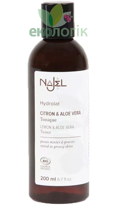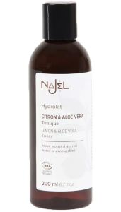 Отриманий паровою дистиляцією свіжих лимонів з органічним алое вера, гідролат від Najel забезпечує в'яжучі та освітлюючі властивості для всіх типів шкіри, зокрема для жирної та комбінованої.