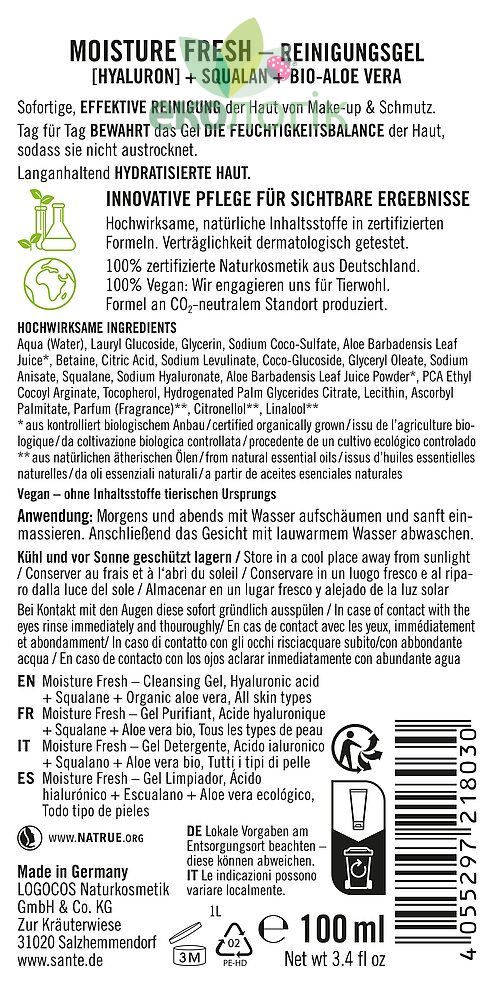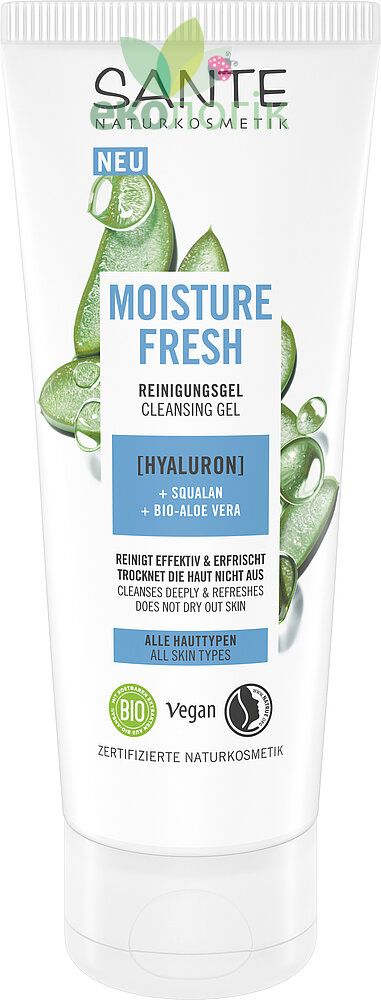 Гідроформула з гіалуроновою кислотою, скваланом та алое забезпечує ретельне очищення без відчуття сухості та стягнутості будь-якого типу шкіри. Гель для вмивання ефективно видаляє забруднення та макіяж, при цьому підтримує баланс вологи в шкіри, даруючи довготривалу свіжість. Делікатна пінка не забиває пори та чинить заспокійливий ефект на чутливі ділянки шкіри. Молекули сквалану у складі гелю легко вбудовуються в ліпідний шар дерми, утворюючи захисну плівку, яка перешкоджає втраті вологи та захищає від негативного впливу навколишнього середовища, що природним чином відновлює захисні функції шкіри. Гіалуронова кислота насичує клітини вологою та знижує ймовірність появи зморшок. Антиоксидантні властивості гелю сприяють відновленню пошкодженої шкіри. Алое підвищує еластичність шкіри, оздоровлюючи діє при запальних процесах. Чисте обличчя з відчутним ефектом зволоження – результат застосування гелю для вмивання серії MOISTURE FRESH від SANTE NATURKOSMETIK!