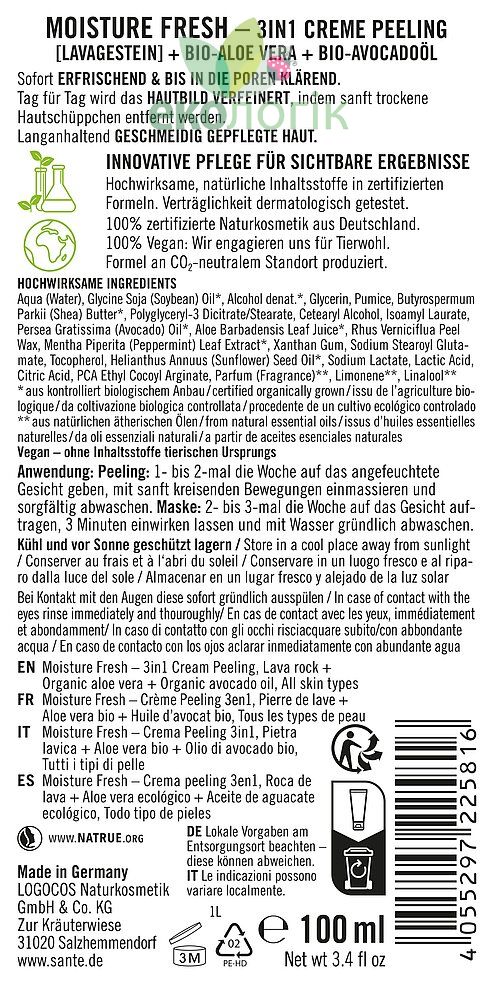 Moisture Fresh 3in1 Creme Peeling mit Lavagestein, Bio-Aloe Vera & Bio-Avocadoöl