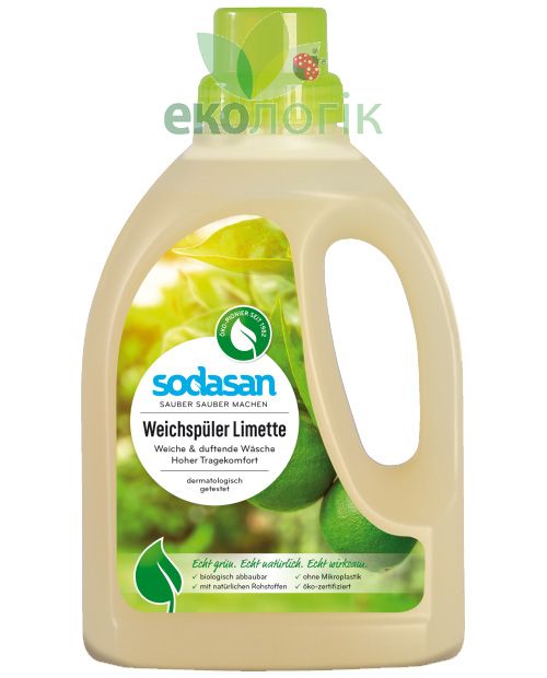 Через накип, що міститься у воді, і прокручування в пральній машині, улюблений одяг і домашній текстиль стає жорстким і колючим. Але, використовуючи пом'якшувач Fabric Softener Лайм від SODASAN Ви в повній мірі відчуєте м'якість і ніжність волокон тканин. Аромат свіжого лайма у складі пом'якшувача тканини додасть відчуття бадьорості, а соєвий лецитин і алое вера роблять тканини ніжними на дотик, завдяки чому одяг не подразнює чутливу шкіру. Натуральна лимонна кислота нейтралізує залишки миючих засобів і розчиняє вапняні відкладення. Тепер завдяки ефекту швидкого прасування пом'якшувача SODASAN Ви швидше приведете речі в порядок і впораєтеся з домашніми клопотами. Речі будуть довше носитися, зберігаючи бездоганний зовнішній вигляд, як «тільки з вітрини» завдяки унікальній формулі збереження волокон тканини.